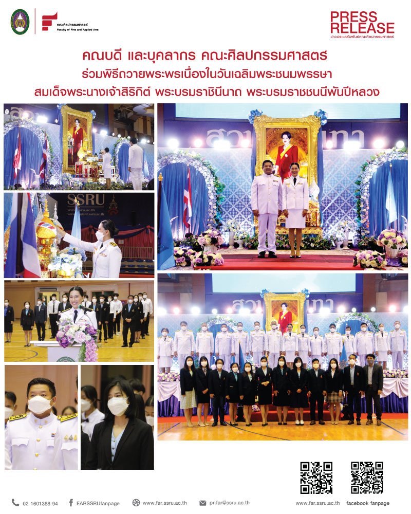 On 11 August 2022, The Faculty of fine and applied arts attended the blessing ceremony on the occasion of Her Majesty Queen Sirikit The Queen Mother. At the event, there was Assoc.Prof.Dr.Chutikarn Sriviboon, Acting President preside over the ceremony. It was held at the Suan Sunandha Health and Sports Center Building, 4th floor, Suan Sunandha Rajabhat University.
