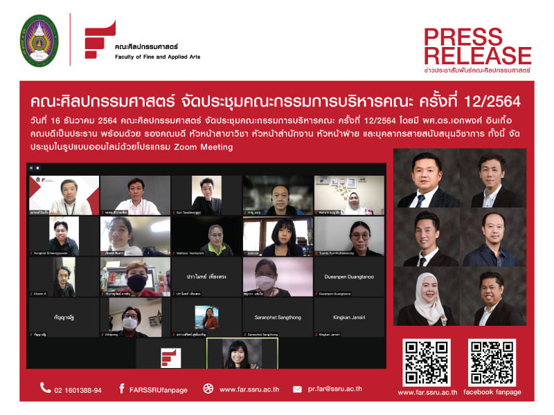 On 16 December 2021, Faculty of Fine and Applied Arts organized the Faculty Executive Committee Meeting No. 12/2564 by Asst.Prof. Dr.Akapong Inkuer, presided over the meeting. It held an online meeting via Zoom Meeting program.