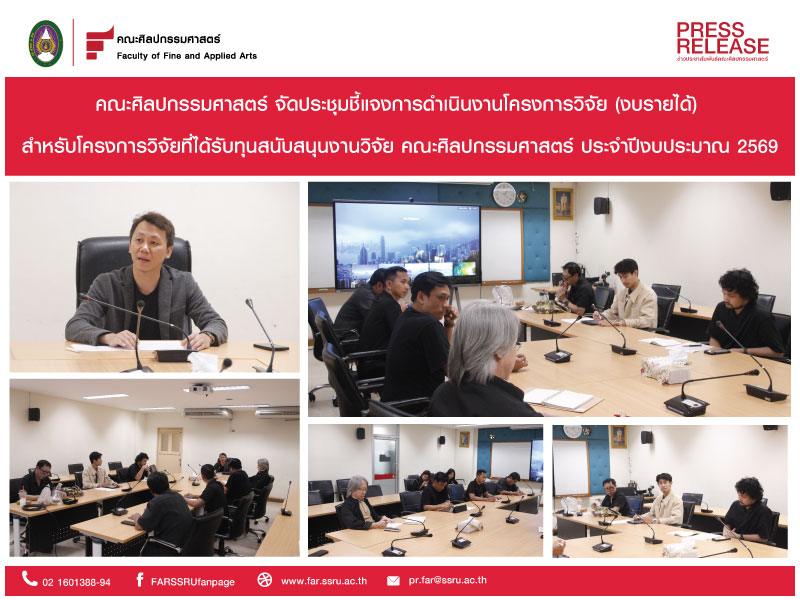 On February 11, 2026, the Faculty of Fine Arts held a meeting to clarify the operation of research projects (income budget) for research projects that received research funding from the Faculty of Fine Arts in the 2026 fiscal year. The Vice Dean for Research and Academic Services chaired the meeting, explaining the operation to the faculty members who received research funding (unit funding) at the Faculty Meeting Room, 1st floor, Faculty of Fine Arts, Suan Sunandha Rajabhat University.