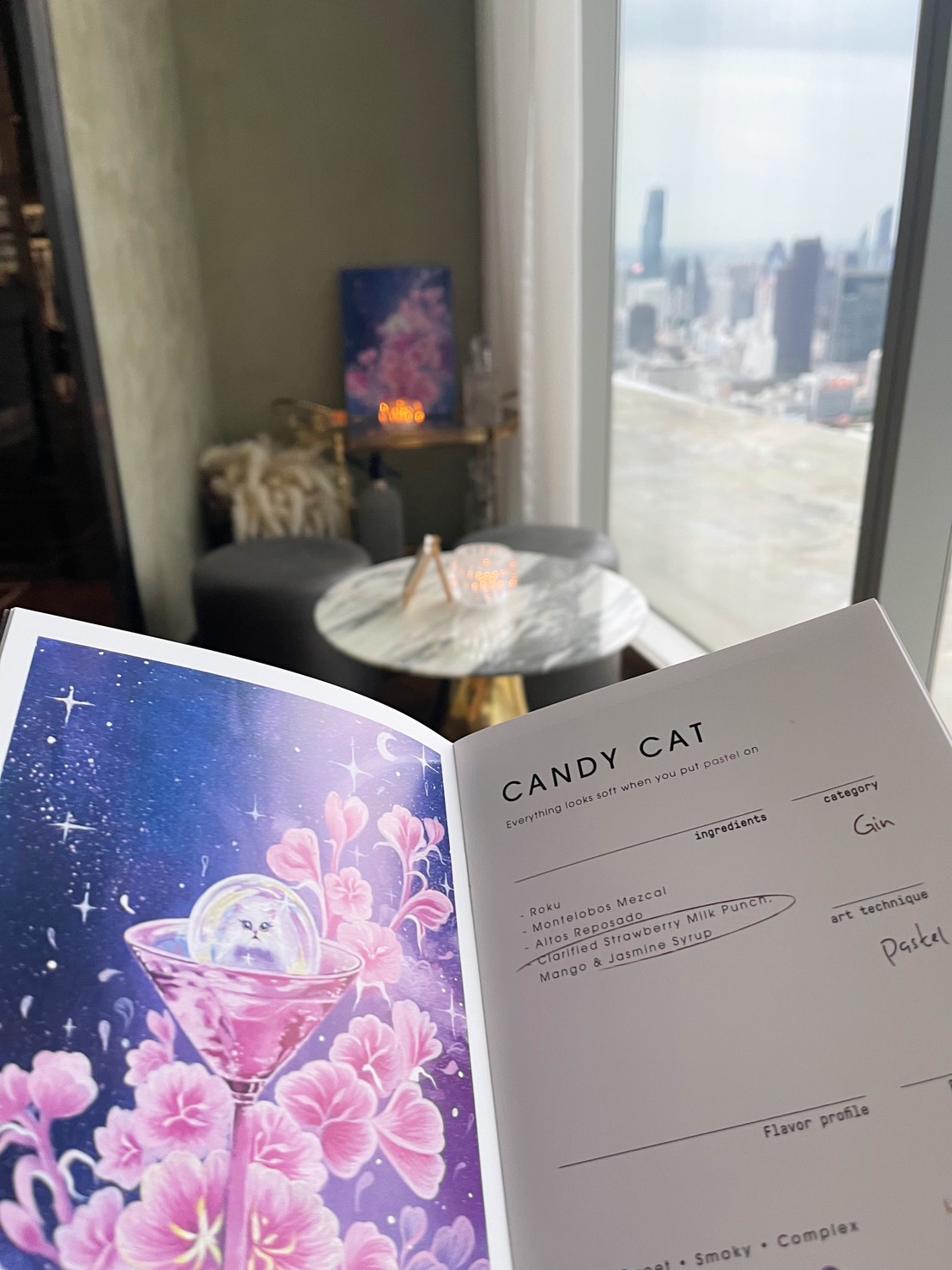 Painting major Had the opportunity to participate in designing illustrations for the cocktail menu for The Loft, a bar designed under the concept of an artist's studio. It is located on the 56th floor of the Waldorf Astoria Bangkok, a 5-star luxury hotel in the Hilton group. it was in the Ratchaprasong area, Pathumwan District, in the heart of Bangkok.