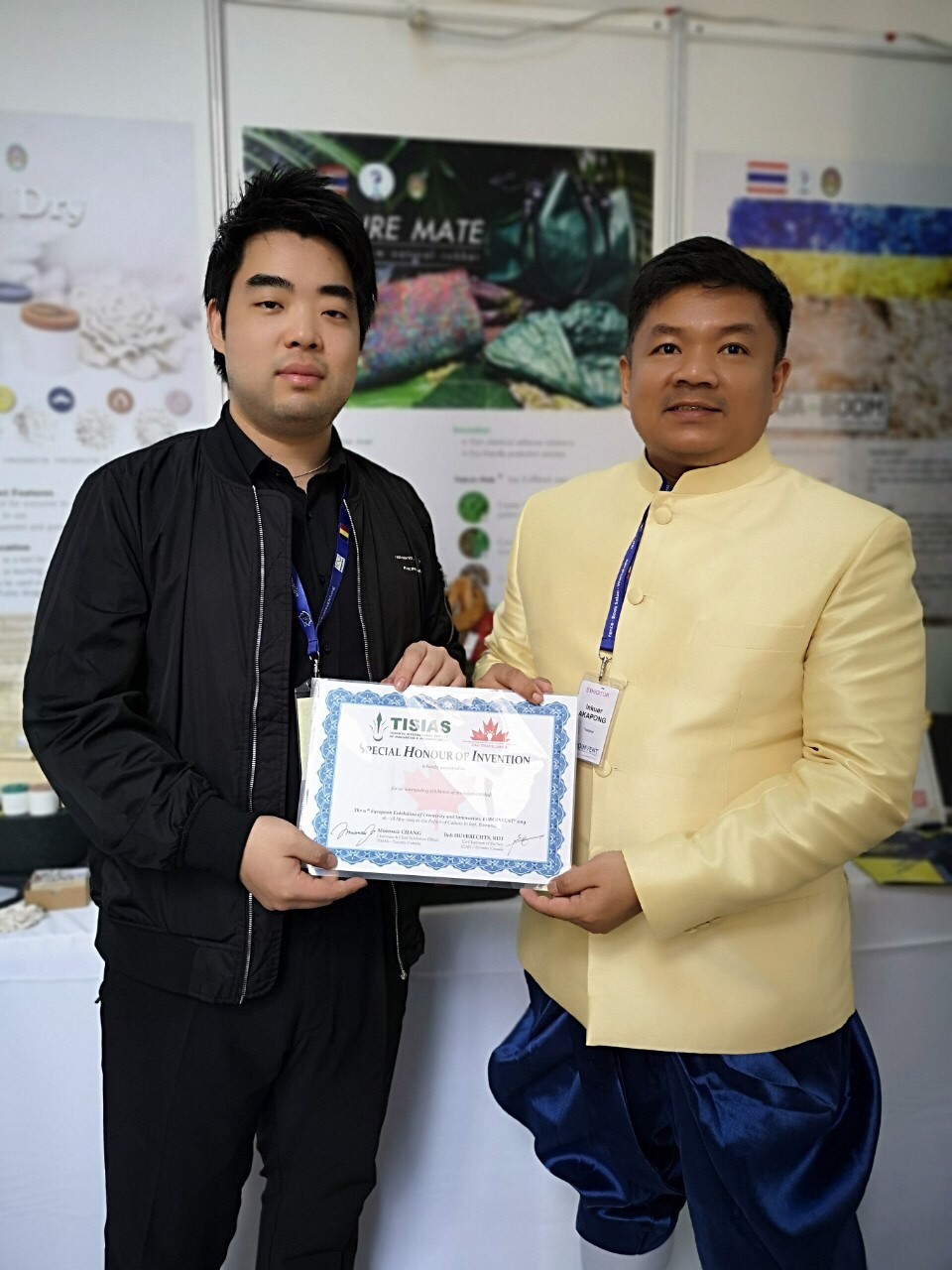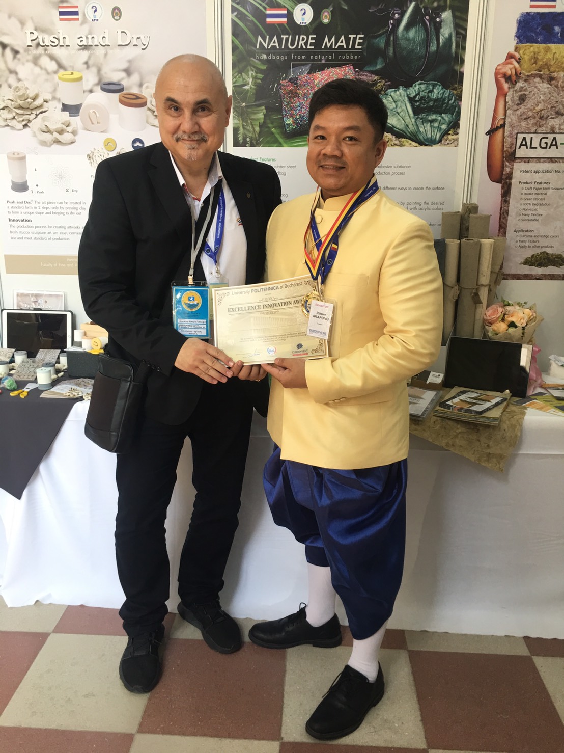 ผู้ช่วยศาสตราจารย์ ดร. เอกพงศ์ อินเกื้อ อาจารย์สาขาการออกแบบผลิตภัณฑ์สร้างสรรค์ คณะศิลปกรรมศาสตร์ มหาวิทยาลัยราชภัฏสวนสุนันทา คว้ารางวัลเหรียญทองผลงานวิจัยนวัตกรรมสิ่งประดิษฐ์ “Natuer Mate” ผลิตภัณฑ์กระเป๋าจากยางพารา ในงาน European Exhibition of Creativity and Innovation : EUROINVENT 2019 ที่จัดขึ้น ณ Palace of Culture เมือง IASI – ประเทศ ROMANIA