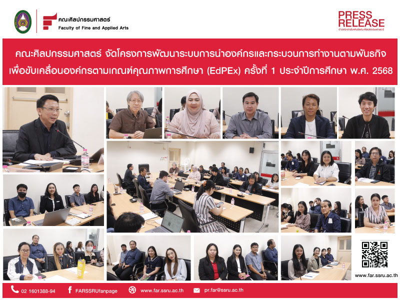 วันที่ 14 ตุลาคม 2568 คณะศิลปกรรมศาสตร์ จัดโครงการพัฒนาระบบการนำองค์กรและกระบวนการทำงานตามพันธกิจ เพื่อขับเคลื่อนองค์กรตามเกณฑ์คุณภาพการศึกษา (EdPEx) ครั้งที่ 1 ประจำปีการศึกษา พ.ศ. 2568 ให้กับผู้บริหารและบุคลากรสายสนับสนุนวิชาการ โดยมีผู้ทรงคุณวุฒิ รศ.ดร.สมพล ดำรงเสถียร มาเป็นวิทยากรให้ความรู้ ณ ห้องประชุมคณาจารย์ ชั้น 1 คณะศิลปกรรมศาสตร์
