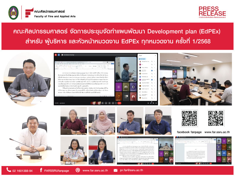 วันที่ 18 เมษายน 2568 คณะศิลปกรรมศาสตร์ จัดการประชุมจัดทำแผนพัฒนา Development plan (EdPEx) สำหรับ ผู้บริหาร และหัวหน้าหมวดงาน EdPEx ทุกหมวดงาน ครั้งที่ 1/2568 โดยเชิญ รศ.ดร.สมพล ดำรงเสถียร ผู้ทรงคุณวุฒิมาให้ความรู้ ณ ห้องประชุมคณาจารย์ ชั้น 1 คณะศิลปกรรมศาสตร์ และในรูปแบบออนไลน์ Google Meet