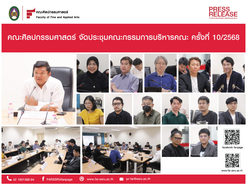 วันที่ 16 ตุลาคม 2568 คณะศิลปกรรมศาสตร์ จัดประชุมคณะกรรมการบริหารคณะ ครั้งที่ 10/2568 โดยมี ผศ.ดร.เอกพงศ์ อินเกื้อ คณบดี เป็นประธานในการประชุม พร้อมด้วย รองคณบดีฝ่ายต่างๆ หัวหน้าสาขาวิชา หัวหน้าสำนักงาน และหัวหน้าฝ่าย เข้าร่วมประชุม ณ ห้องประชุมคณาจารย์ ชั้น 1 คณะศิลปกรรมศาสตร์ มหาวิทยาลัยราชภัฏสวนสุนันทา