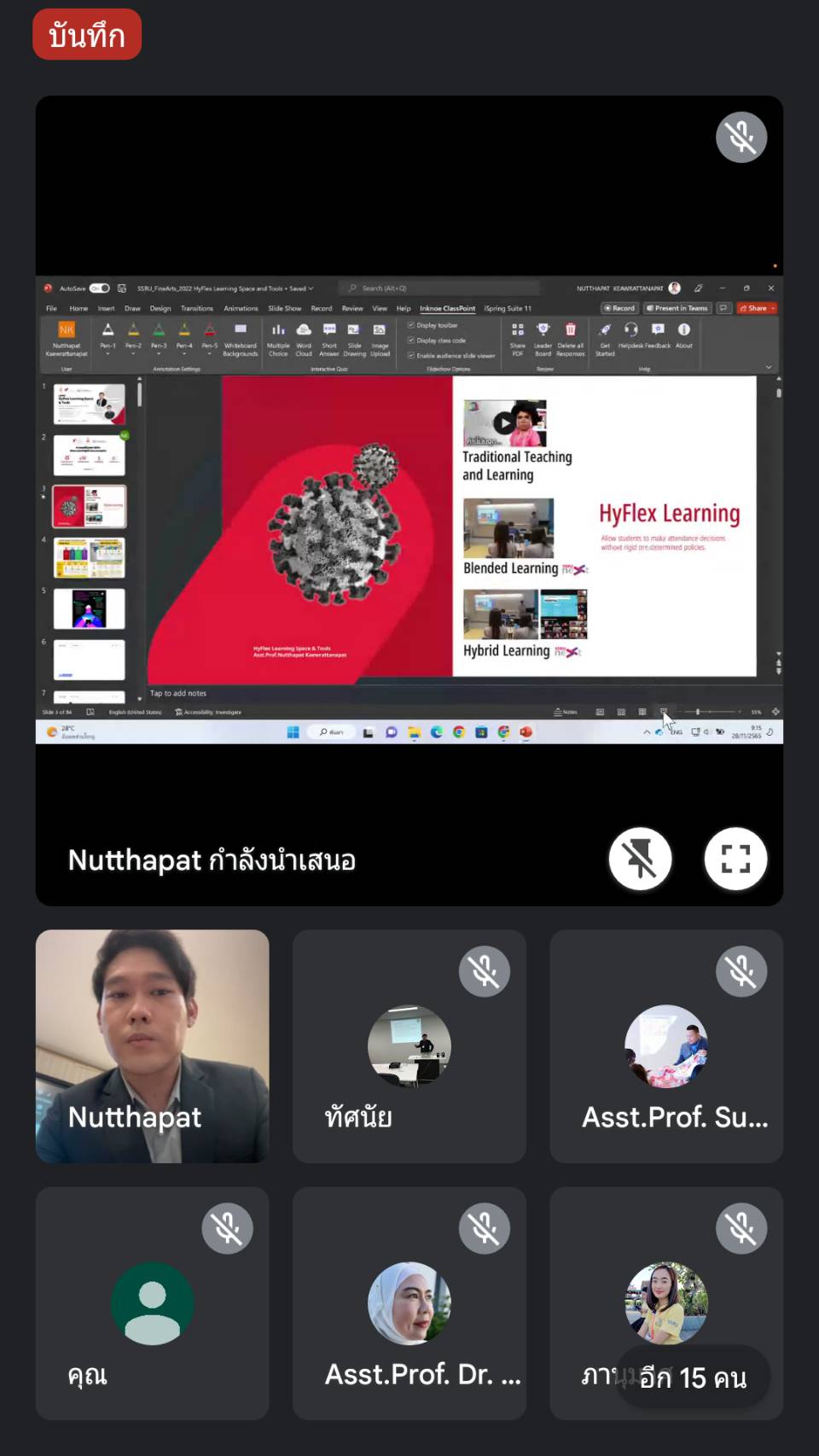วันที่ 28 พฤศจิกายน 2565 คณะศิลปกรรมศาสตร์ จัดโครงการอบรมพัฒนารูปแบบการเรียนการสอนด้วยระบบ Hybrid Classroom เรื่อง "เสริมสร้างประสบการณ์เรียนรู้ที่ยืดหยุ่นต่อผู้เรียน" Hyflex Learning Space and Experience ในรูปแบบ Onsite ณ สำนักวิชาการศึกษาทั่วไปและการเรียนรู้อิเล็กทรอนิกส์ ห้อง 3422 และในรูปแบบ Online ด้วย Google Meet โดยได้รับเกียรติจาก ผศ.ณัฐภัทร แก้วรัตนภัทร รองผู้อำนวยการฝ่ายวิจัยและพัฒนานวัตกรรมการจัดการเรียนรู้ สำนักวิชาการศึกษาทั่วไปและนวัตกรรมการเรียนรู้อิเล็กทรอนิกส์ มหาวิทยาลัยราชภัฏสวนสุนันทา เป็นวิทยากรให้ความรู้