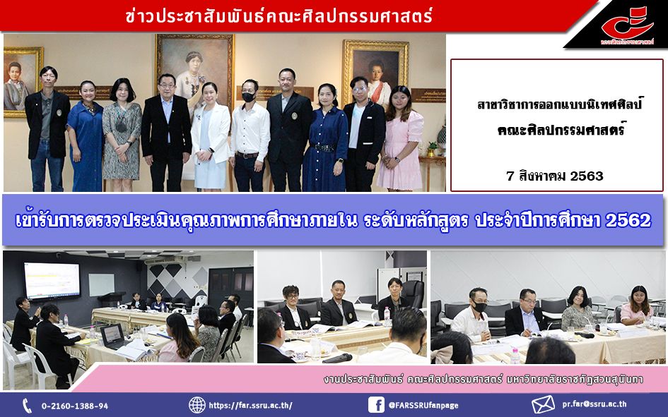 วันที่ 7 สิงหาคม 2563 คณะศิลปกรรมศาสตร์ จัดการตรวจประเมินคุณภาพการศึกษา ระดับหลักสูตร ประจำปีการศึกษา 2562 สาขาวิชาการออกแบบนิเทศศิลป์ พิธีเปิด ณ ห้องประชุมคณาจารย์ โดยมีผู้ช่วยศาสตราจารย์ ดร.ชุติมา มณีวัฒนา คณบดีคณะศิลปกรรมศาสตร์ ผู้บริหาร หัวหน้าสาขาวิชา เข้าร่วมการตรวจประเมินฯ และได้รับเกียรติจากผู้ทรงคุณวุฒิภายนอกเป็นกรรมการตรวจการประเมิน ได้แก่ อาจารย์ ดร.ธนาทร เจียรกุล ประธาน ผู้ช่วยศาสตราจารย์ ดร.โสมฉาย บุญญานันต์ และอาจารย์บุญส่ง อุดมกิจโกศล กรรมการ นางสาวรุจเรศ พินธุวัฒน์ เลขานุการ
