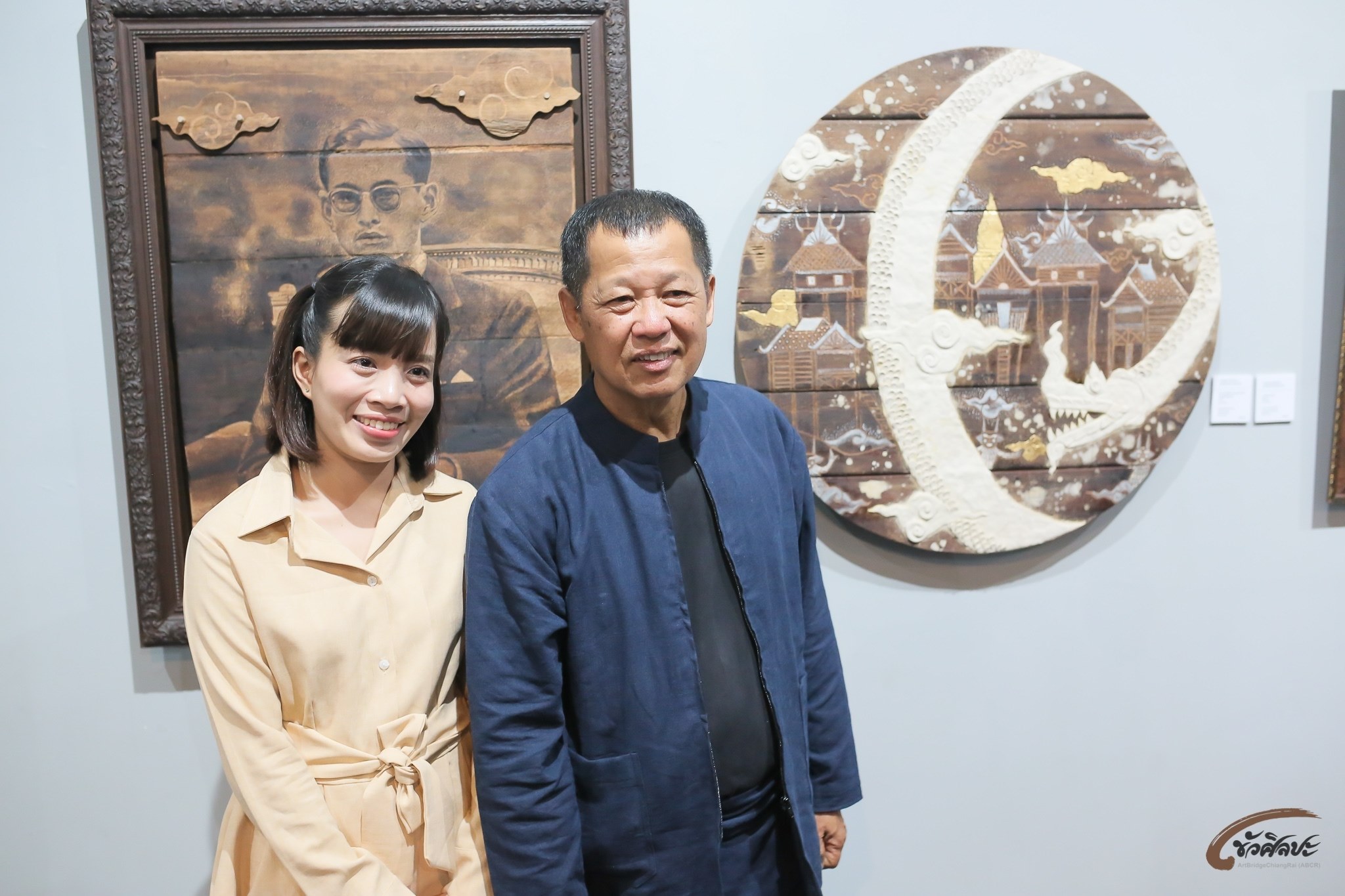 ผลงานที่ อาจารย์จารุวรรณ เมืองขวา นำมาร่วมจัดแสดงในครั้งนี้ มีจำนวน 2 ชิ้น ได้แก่ ผลงาน “พระบาทสมเด็จพระบรมชนการธิเบศร มหาภูมิพลอดุลยเดช” เป็นผลงานที่ใช้เทคนิคการแกะไม้ ชิ้นผลงานขนาด 60x80 เซ็นติเมตร และผลงาน “สวรรค์และความดี” เป็นผลงานที่ใช้เทคนิค วัสดุผสม ขนาด 80x80 เซ็นติเมตร