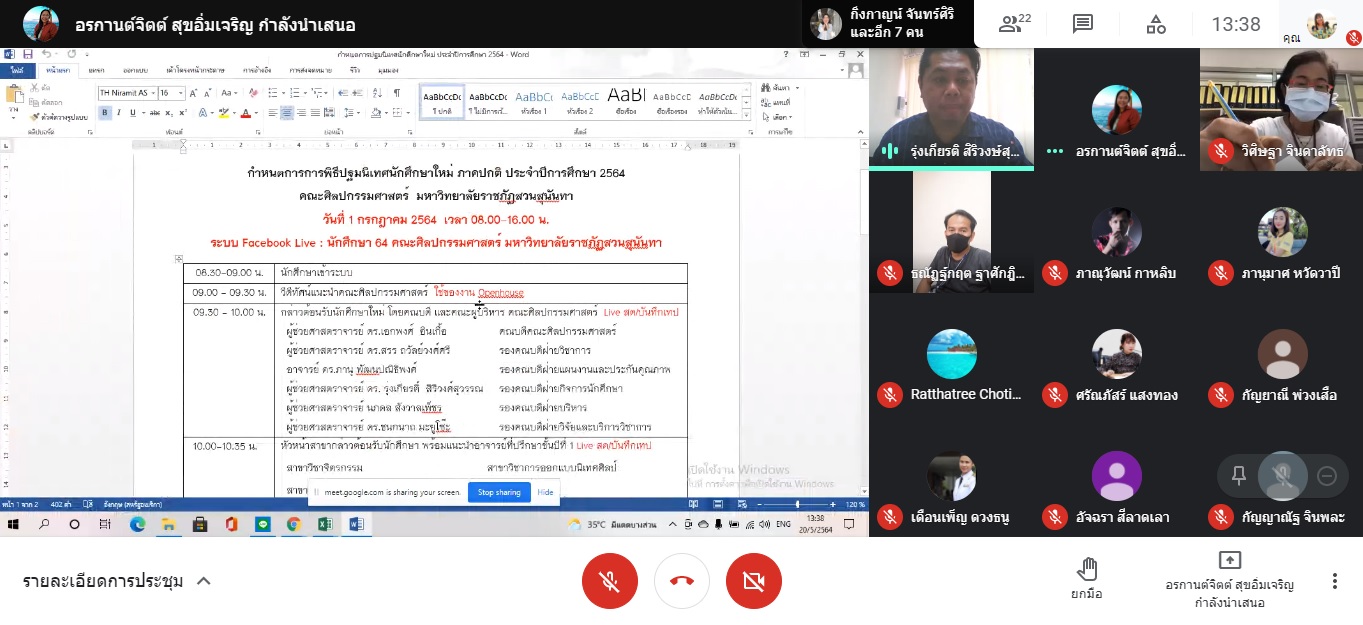 วันที่ 20 พฤษภาคม 2564 ฝ่ายกิจการนักศึกษา คณะศิลปกรรมศาสตร์ โดย ผศ.ดร.รุ่งเกียรติ สิริวงษ์สุวรรณ รองคณบดีฝ่ายกิจการนักศึกษาเป็นประธาน จัดการประชุมบุคลากรสายสนับสนุนวิชาการเพื่อเตรียมความพร้อมการจัดกิจกรรมปฐมนิเทศนักศึกษาใหม่ ประจำปีการศึกษา 2564 รูปแบบออนไลน์ผ่านสื่อโซเชียลมีเดีย ซึ่งจะจัดในช่วงต้นเดือนกรกฎาคม ทั้งนี้ ได้เชิญ อ.ภาณุวัฒน์ กาหลิบ หัวหน้าสาขาวิชาการออกแบบนิเทศศิลป์ เข้าร่วมประชุมเป็นที่ปรึกษาในเรื่องการจัดทำสื่อให้ความรู้ต่างๆที่จะใช้ประกอบการปฐมนิเทศในครั้งนี้