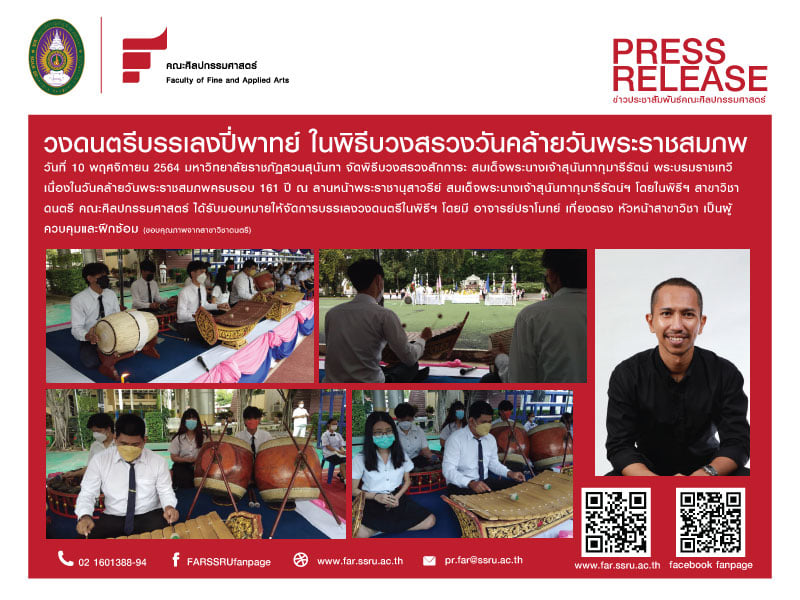 หน้าหลัก > ข่าว > ข่าวประชาสัมพันธ์ / กิจกรรม > วงษ์ดนตรีบรรเลงปี่พาทย์ โดยสาขาวิชาดนตรี ในพิธีบวงสรวงครบรอบ 161 ปี