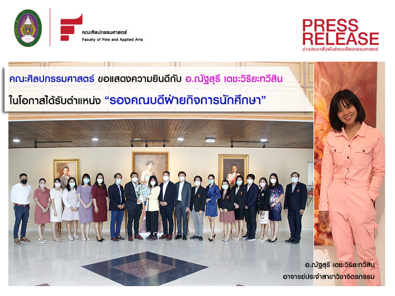 วันที่ 2 มีนาคม 2565 คณะศิลปกรรมศาสตร์ นำโดย ผศ.ดร.เอกพงศ์ อินเกื้อ คณบดี พร้อมด้วย รองคณบดี ประธานหลักสูตรดุษฎีบัณฑิต และเจ้าหน้าที่คณะศิลปกรรมศาสตร์ มอบดอกไม้แสดงความยินดีแด่ อาจารย์ณัฐสุรี เตชะวิริยะทวีสิน เนื่องในโอกาสได้รับการแต่งตั้งให้ดำรง ตำแหน่ง รองคณบดีฝ่ายกิจการนักศึกษา คณะศิลปกรรมศาสตร์