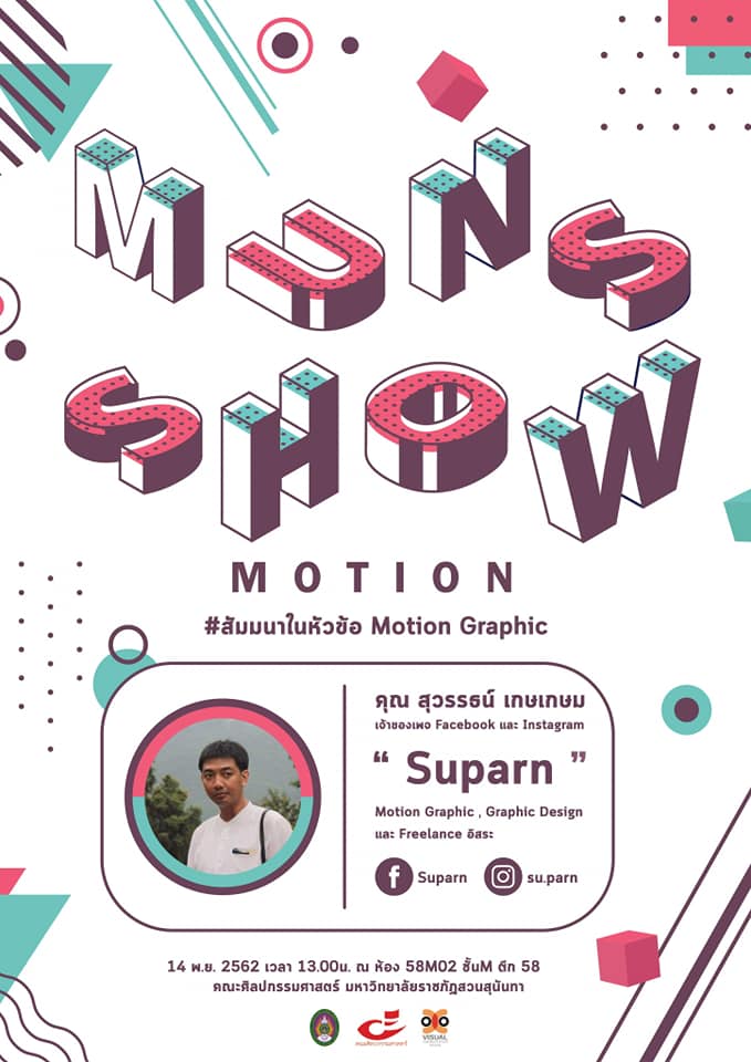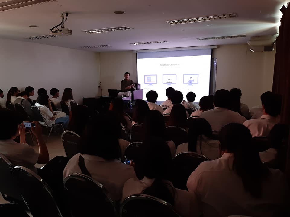 วันที่ 14 พฤศจิกายน 2562 สาขาวิชาการออกแบบนิเทศศิลป์ จัดการอบรม หัวข้อ Motion Graphic เพื่อเสริมความรู้ให้แก่นักศึกษา วิทยากรบรรยาย โดย คุณสุวรรธน์ เกษเกษม เจ้าของเพจ "Suparn" ณ ห้อง 58M02 ชั้น M คณะศิลปกรรมศาสตร์