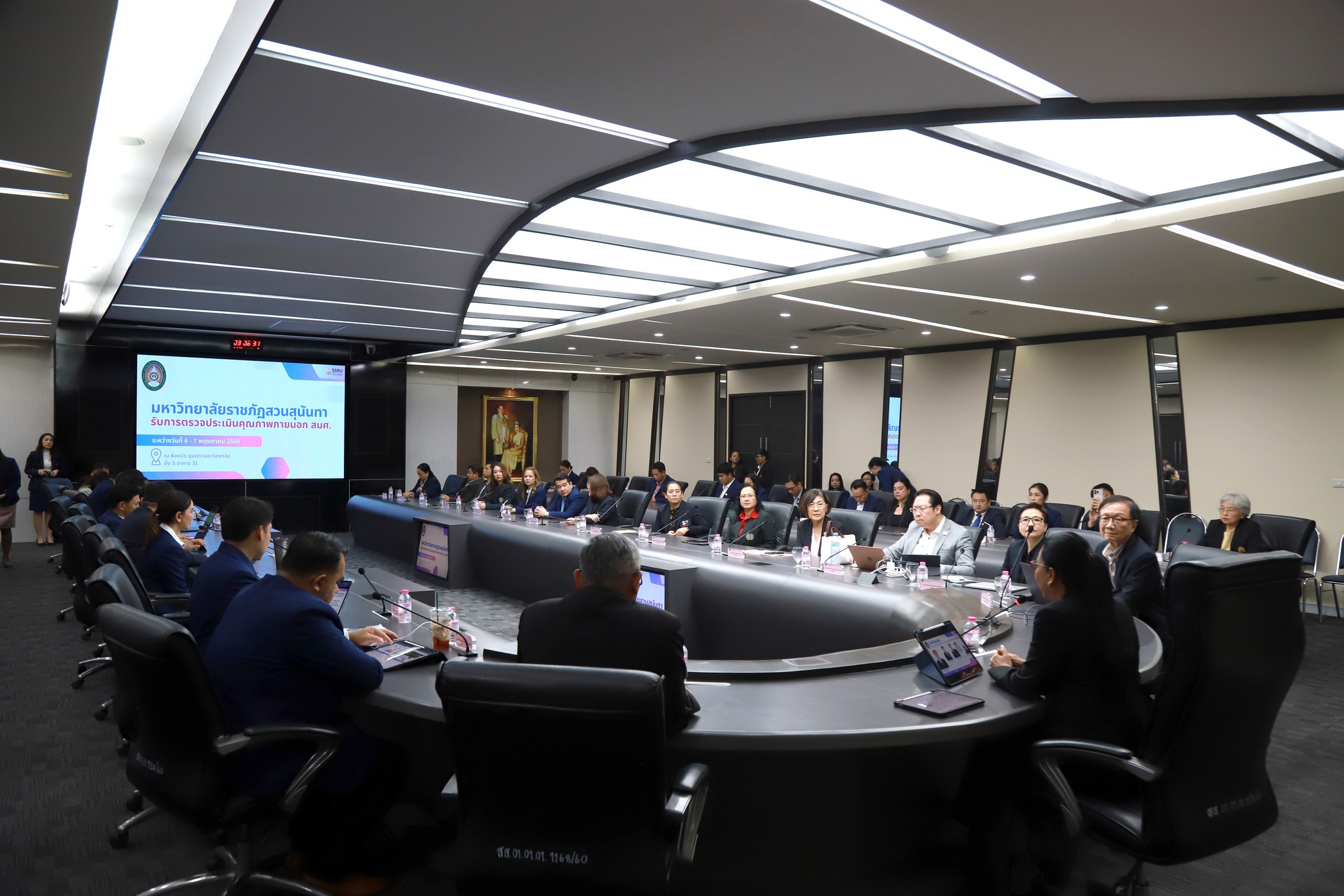 ในการนี้ รองศาสตราจารย์ ดร.ชุติกาญจน์ ศรีวิบูลย์ อธิการบดีมหาวิทยาลัยราชภัฏสวนสุนันทา ให้เกียรติเป็นประธานกล่าวรายงานผลการดำเนินงานตามเกณฑ์มาตรฐานคุณภาพระดับอุดมศึกษา ประจำปีงบประมาณ พ.ศ. 2568 โดยมีคณะผู้บริหารเข้าร่วมรับการประเมินอย่างพร้อมเพรียง