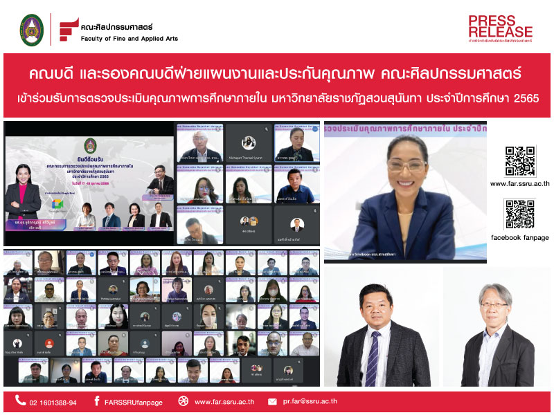 วันที่ 17 ตุลาคม 2566 ผศ.ดร.เอกพงศ์ อินเกื้อ คณบดีคณะศิลปกรรมศาสตร์ พร้อมด้วย ผศ.วินัย หมั่นคติธรรม รองคณบดีฝ่ายแผนงานและประกันคุณภาพ เข้าร่วมการตรวจประเมินคุณภาพการศึกษาภายใน มหาวิทยาลัยราชภัฏสวนสุนันทา ประจำปีการศึกษา 2565 โดยมี รศ.ดร.ชุติกาญจน์ ศรีวิบูลย์ อธิการบดี เป็นประธานกล่าวต้อนรับคณะกรรมการผู้ทรงคุณวุฒิ ซึ่งในปีนี้ได้รับเกียรติจาก รศ.ดร.ไทย ทิพย์สุวรรณกุล เป็นประธานกรรมการตรวจประเมินในครั้งนี้ จัดขึ้นผ่านระบบออนไลน์โปรแกรม Google meet
