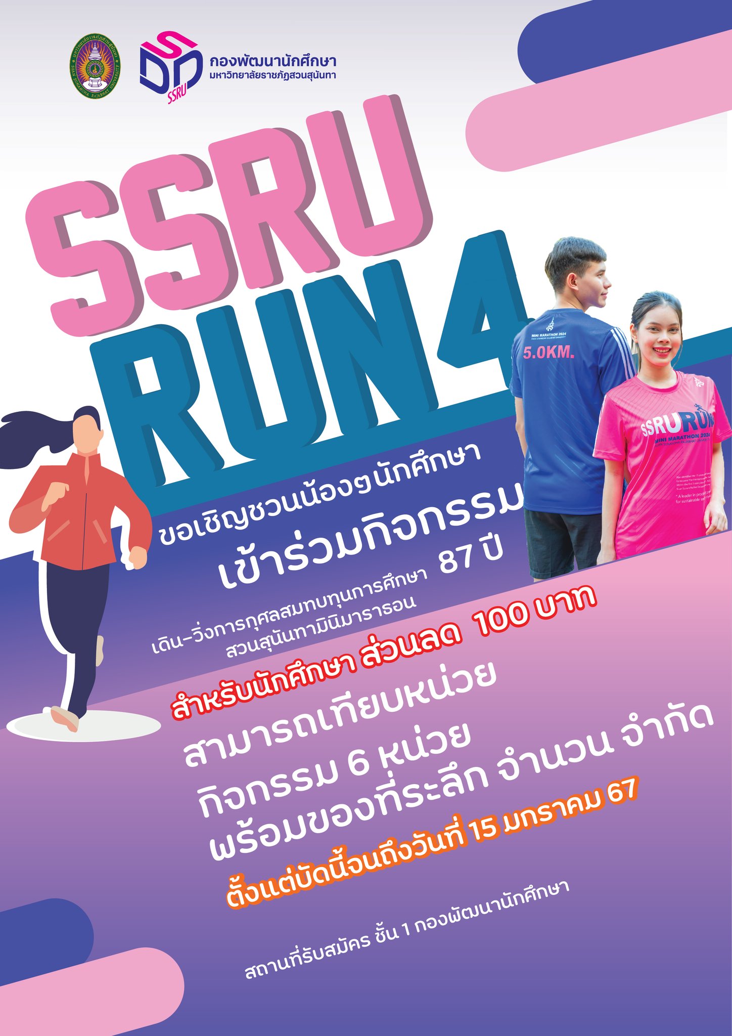 มกราคม 2567 "กิจกรรมเดิน-วิ่งการกุศล สมทบทุนการศึกษา 87 ปี สวนสุนันทา มินิมาราธอน ครั้งที่ 4" รีบสมัครกันเยอะๆนะคะ >>วันอาทิตย์ ที่ 18