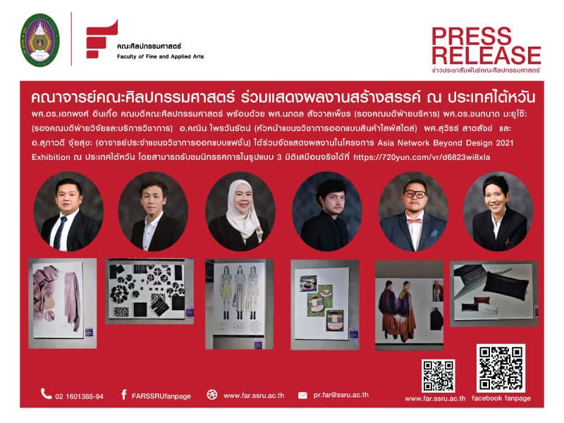 ผศ.ดร.เอกพงศ์ อินเกื้อ คณบดีคณะศิลปกรรมศาสตร์ ผศ.นภดล สังวาลเพ็ชร รองคณบดีฝ่ายบริหาร ผศ.ดร.ชนกนาถ มะยูโซ๊ะ รองคณบดีฝ่ายวิจัยและบริการวิชาการ อ.คณิน ไพรวันรัตน์ หัวหน้าแขนงวิชาการออกแบบสินค้าไลฟ์สไตล์ ผศ.สุวิธธ์ สาดสังข์ และ อ.สุภาวดี จุ้ยสุขะ อาจารย์ประจำแขนงวิชาการออกแบบแฟชั่น ได้ร่วมจัดแสดงผลงานในโครงการ Asia Network Beyond Design 2021 Exhibition