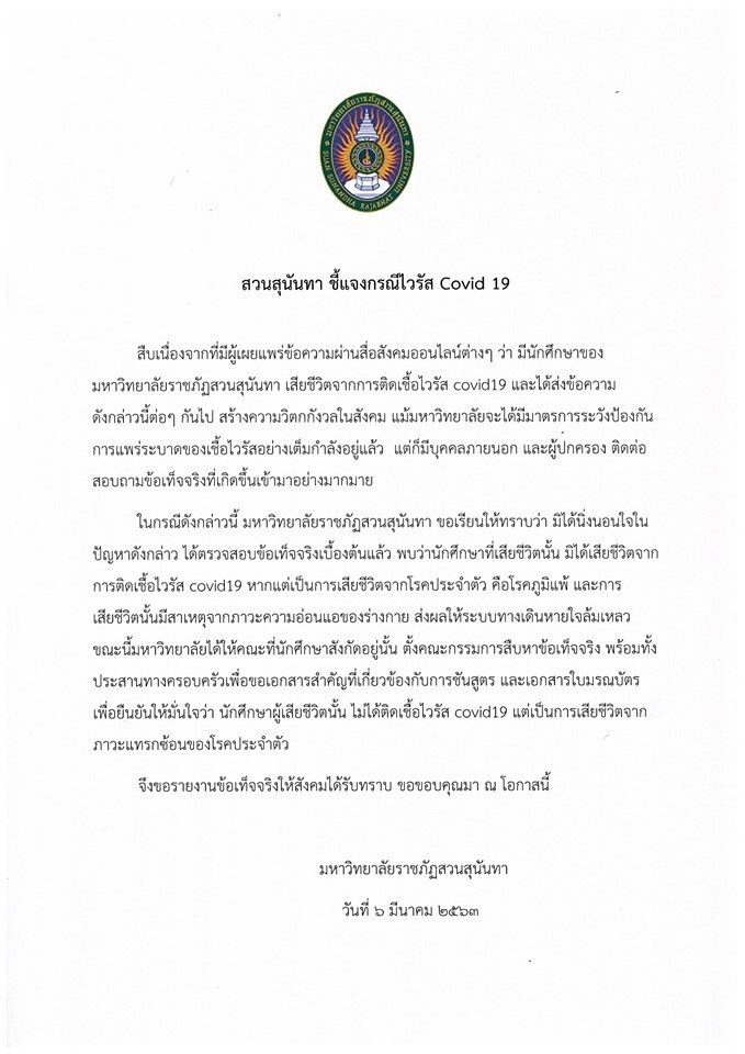 สวนสุนันทา ชี้แจงกรณีมีนักศึกษาเสียชีวิต