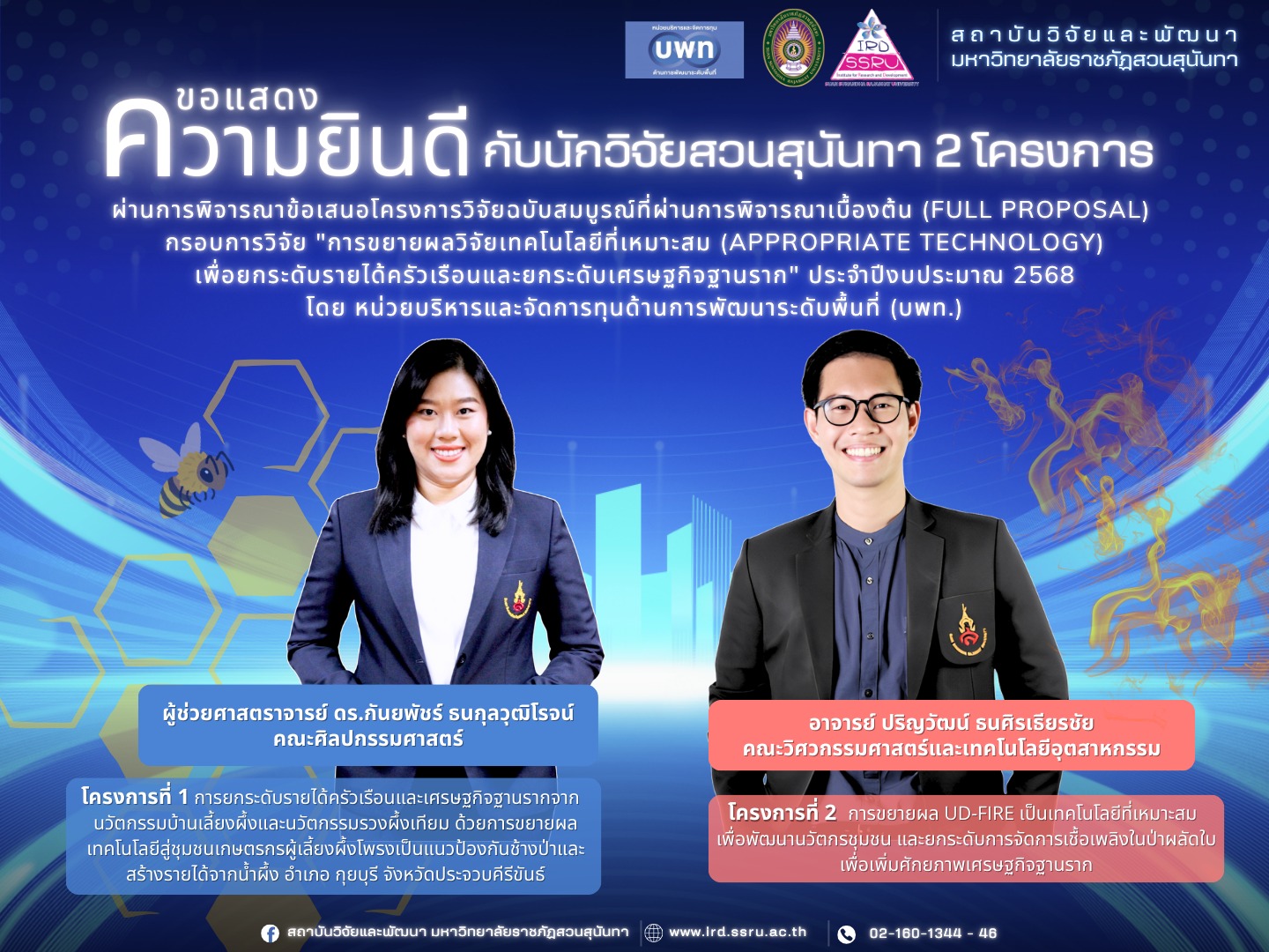 สถาบันวิจัยและพัฒนา มหาวิทยาลัยราชภัฏสวนสุนันทา ขอแสดงความยินดีกับคณาจารย์ผู้วิจัยทั้งสองท่าน ที่ผ่านการพิจารณาเข้าสู่กระบวนการสนับสนุนทุนวิจัยในระดับพื้นที่ โดยเป็นส่วนสำคัญในการขับเคลื่อนองค์ความรู้ เทคโนโลยี และนวัตกรรมสู่การพัฒนาที่ยั่งยืนในระดับชุมชน