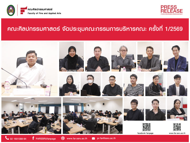 วันที่ 15 มกราคม 2569 คณะศิลปกรรมศาสตร์ จัดประชุมคณะกรรมการบริหารคณะ ครั้งที่ 1/2569 โดยมี ผศ.ดร.เอกพงศ์ อินเกื้อ คณบดี เป็นประธานในการประชุม พร้อมด้วย รองคณบดีฝ่ายต่างๆ หัวหน้าสาขาวิชา หัวหน้าสำนักงาน และหัวหน้าฝ่าย เข้าร่วมประชุม ณ ห้องประชุมคณาจารย์ ชั้น 1 คณะศิลปกรรมศาสตร์ มหาวิทยาลัยราชภัฏสวนสุนันทา
