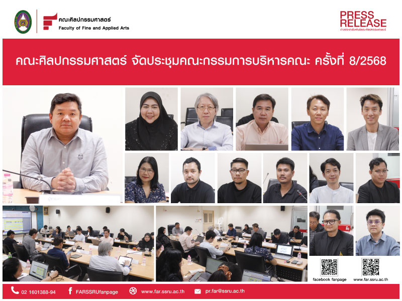 วันที่ 21 สิงหาคม 2568 คณะศิลปกรรมศาสตร์ จัดประชุมคณะกรรมการบริหารคณะ ครั้งที่ 8/2568 โดยมี ผศ.ดร.เอกพงศ์ อินเกื้อ คณบดี เป็นประธานในการประชุม พร้อมด้วย รองคณบดีฝ่ายต่างๆ หัวหน้าสาขาวิชา ผู้แทนหัวหน้าสาขาวิชา หัวหน้าสำนักงาน และหัวหน้าฝ่าย เข้าร่วมประชุม ณ ห้องประชุมคณาจารย์ ชั้น 1 คณะศิลปกรรมศาสตร์ มหาวิทยาลัยราชภัฏสวนสุนันทา