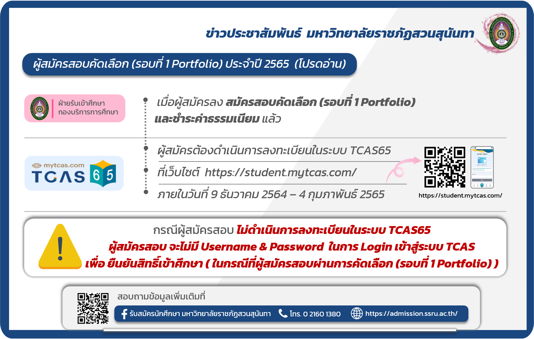 #คู่มือการลงทะเบียนในระบบ TCAS65 https://cts.ssru.ac.th/File/IS/Announce/Files/pxujt3ko.pdf