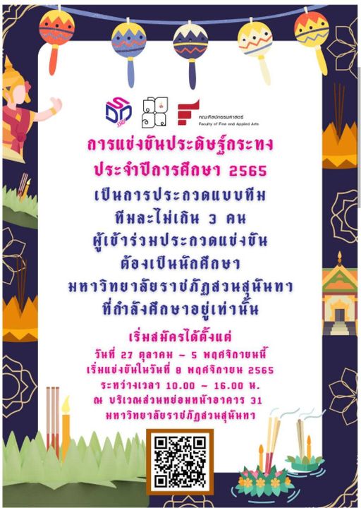คณะศิลปกรรมศาสตร์ ขอเชิญนักศึกษามหาวิทยาลัยทุกท่าน ร่วมการแข่งขันประดิษฐ์กระทง ประจำปีการศึกษา 2565