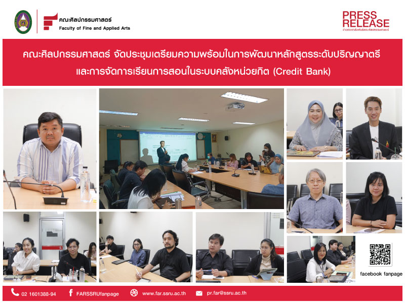 วันที่ 27 มิถุนายน 2567 คณะศิลปกรรมศาสตร์ โดย ฝ่ายบริการการศึกษา จัดประชุมเพื่อเตรียมความพร้อมในการพัฒนาหลักสูตรระดับปริญญาตรี และการจัดการเรียนการสอนในระบบคลังหน่วตกิต (Credit Bank) โดยมี ผศ.ดร.เอกพงศ์ อินเกื้อ คณบดีเป็นประธานในการประชุม พร้อมด้วย รองคณบดี ห้วหน้าสาขาวิชา หัวหน้าฝ่ายบริการการศึกษา และเจ้าหน้าที่ฝ่ายบริการการศึกษา ณ ห้องประชุมคณาจารย์ ชั้น 1 คณะศิลปกรรมศาสตร์