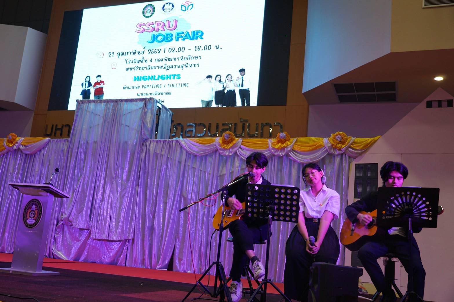 วันที่ 21 กุมภาพันธ์ 2568 ผศ.ดร.รุ่งเกียรติ สิริวงษ์สุวรรณ และ อ.ชัชวาลย์ กลมกล่อม อาจารย์ประจำสาขาวิชาดนตรี คณะศิลปกรรมศาสตร์ นำนักศึกษาร่วมแสดงดนตรีในงานมหกรรม SSRU Job Fair 2025 ยุติความยากจนยั่งยืน ซึ่งจัดโดย กองพัฒนานักศึกษา มหาวิทยาลัยราชภัฏสวนสุนันทา ร่วมกับ สำนักงานจัดหางานกรุงเทพมหานคร เขตพื้นที่ 8 กรมการจัดหางานกระทรวงแรงงาน ณ อาคารศูนย์สุขภาพและกีฬาสวนสุนันทา ชั้น 4 กองพัฒนานักศึกษา