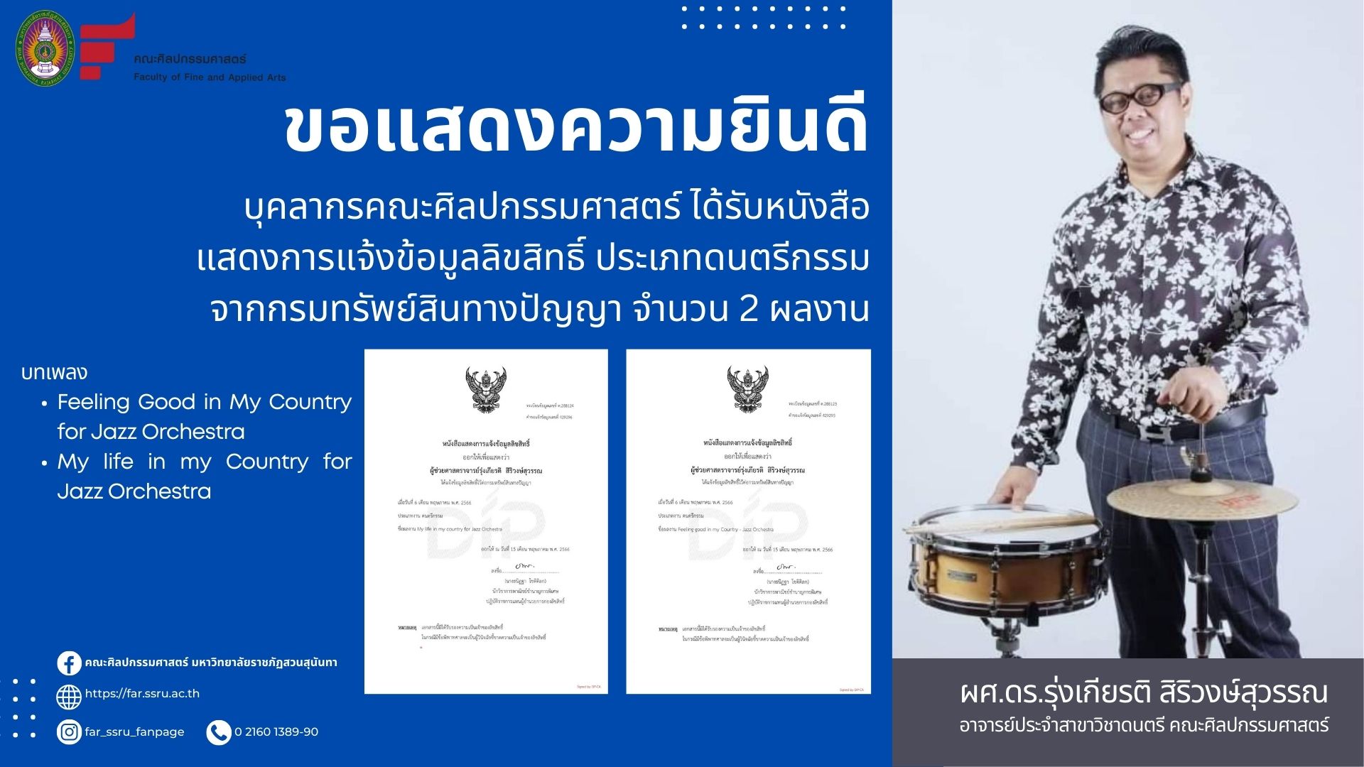 อาจารย์ประจำสาขาวิชาดนตรี คณะศิลปกรรมศาสตร์ ได้รับการจดสิทธิบัตรผลงานสร้างสรรค์