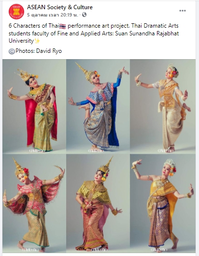 วันที่ 5 ตุลาคม 2564 ภาพชุดการแต่งกายในชุดการแสดงรำของนักศึกษาแขนงวิชานาฏศิลป์ไทย คณะศิลปกรรมศาสตร์ ได้ถูกนำลงเผยแพร่ใน page ASEAN Society and Culture