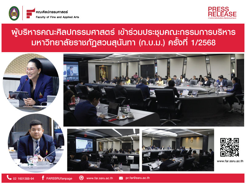 วันที่ 13 มกราคม 2568 ผศ.ดร.เอกพงศ์ อินเกื้อ คณบดีคณะศิลปกรรมศาสตร์ เข้าร่วมการประชุมคณะกรรมการบริหารมหาวิทยาลัยราชภัฏสวนสุนันทา (ก.บ.ม.) ครั้งที่ 1/2568 โดยมี รศ.ดร.ชุติกาญจน์ ศรีวิบูลย์ รักษาราชการแทนอธิการบดีมหาวิทยาลัยราชภัฏสวนสุนันทา เป็นประธานในการประชุม ณ ห้องประชุมสภามหาวิทยาลัย อาคาร 31 ชั้น 5 มหาวิทยาลัยราชภัฏสวนสุนันทา และผ่านระบบออนไลน์