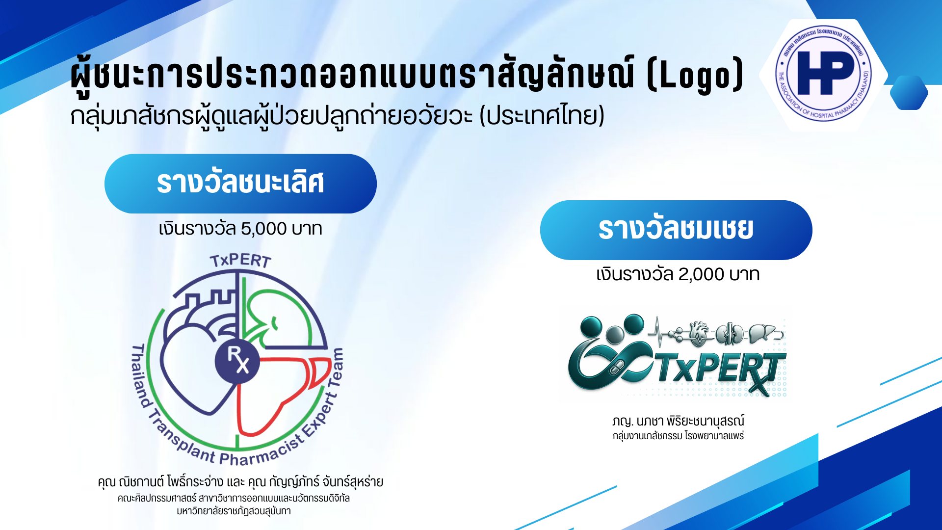 ได้รับ "รางวัลชนะเลิศ" การประกวดออกแบบตราสัญลักษณ์ (Logo) กลุ่มเภสัชกรผู้ดูแลผู้ป่วยปลูกถ่ายอวัยวะ (ประเทศไทย) จัดโดย สมาคมเภสัชกรรมโรงพยาบาล (ประเทศไทย)